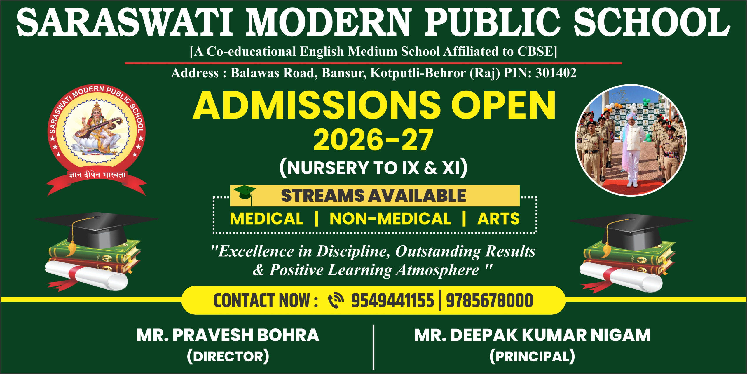 Saraswati modern Public School is an English medium secondary school affiliated to CBSE Delhi. This school is founded and managed by the top & the oldest management of Bansur "Saraswati Modern Vidhyalaya Samiti".